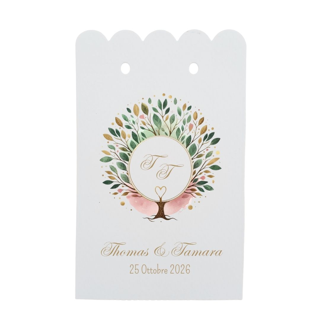 - Design: Acquerello con albero della vita, foglie verdi/oro/rosa, iniziali personalizzate