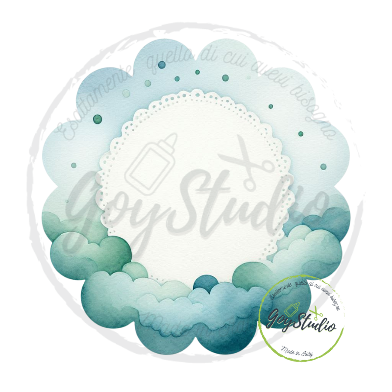 Le nuvole soffici creano un effetto rassicurante e dolce, mentre la palette azzurro-verde evoca tranquillità e purezza. Il formato circolare si adatta perfettamente a molteplici utilizzi, garantendo sempre risultati teneri e memorabili.