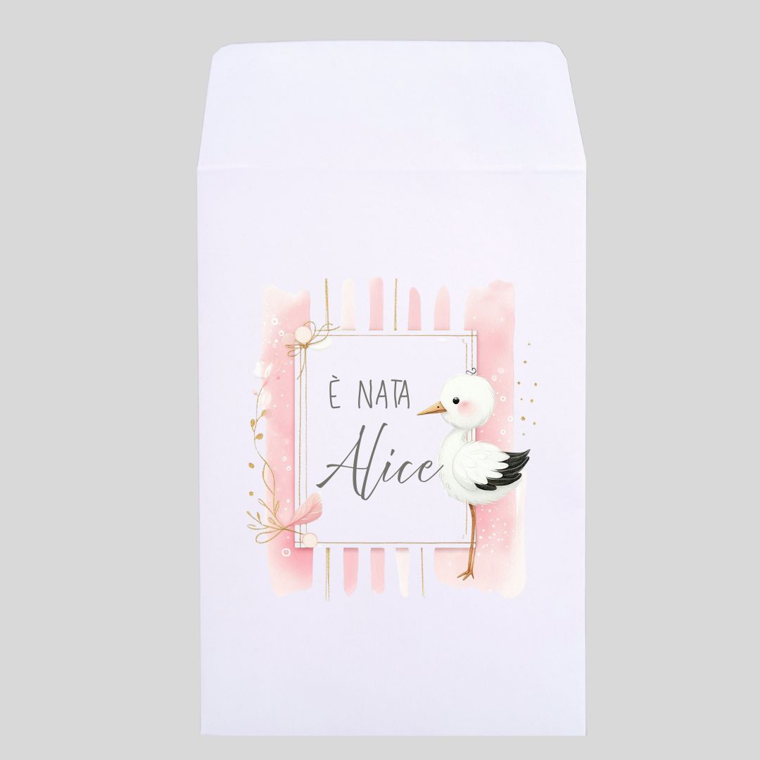 Non è il solito sacchetto generico. È personalizzato con il nome della neonata, ha una cicogna disegnata ad acquerello (quella che “porta i bambini”, per intenderci), e un design delicato che non urla “ROSA SHOCKING” da un chilometro di distanza. È fatto a mano, in Sardegna, con carta italiana certificata. E sì, puoi personalizzarlo come vuoi.