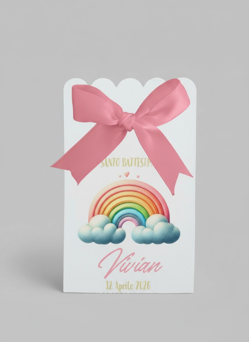 Vuoi tutto coordinato per il battesimo? Inviti, menu, segnaposto, sacchetti, tag – possiamo creare la stationery completa con lo stesso arcobaleno pastello. Tutto fatto a mano in Sardegna.