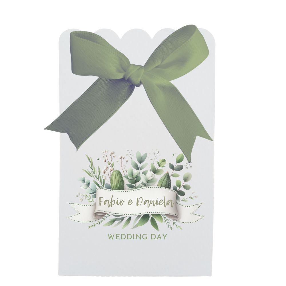 Cerchi una scatolina portaconfetti succulenti per il tuo matrimonio? Questa è quella che sussurra “siamo veri, siamo naturali, siamo qui per durare”. Una composizione di succulenti e foglie verdi in tonalità salvia, con un nastro coordinato e la scritta “Wedding Day” che non grida, ma suggerisce.